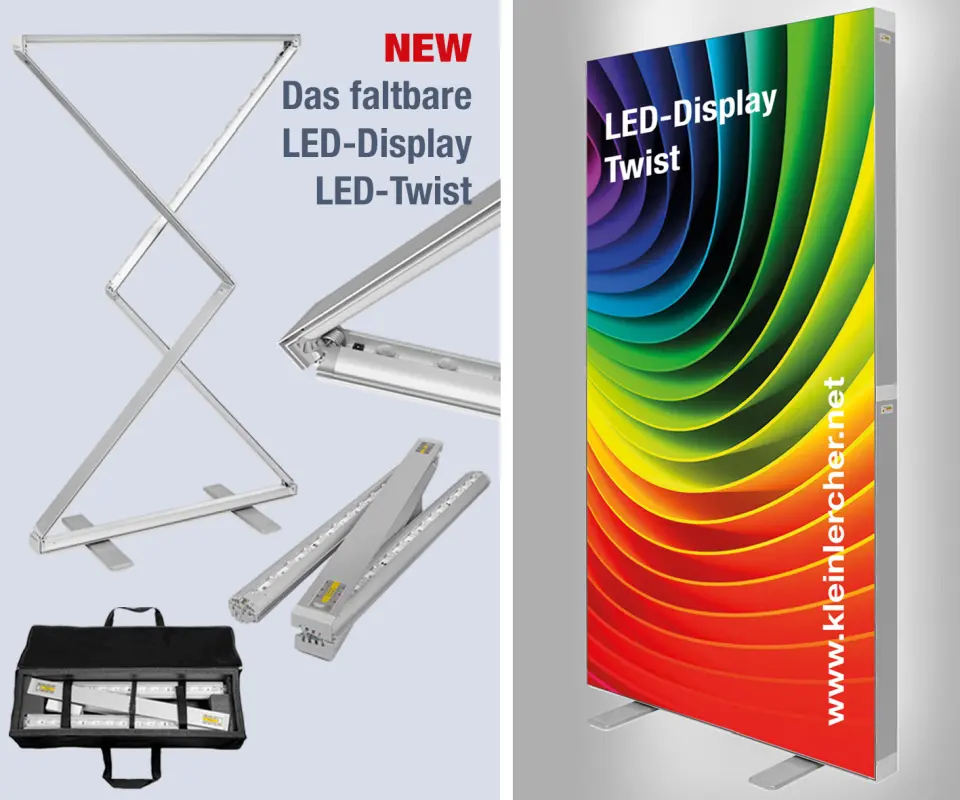 Mit den praktischen Ergänzungen zum LED-Display – der Falt-Theke Twist und dem Falt-Prospektständer Foldup wird daraus die perfekte SET-Kombi.